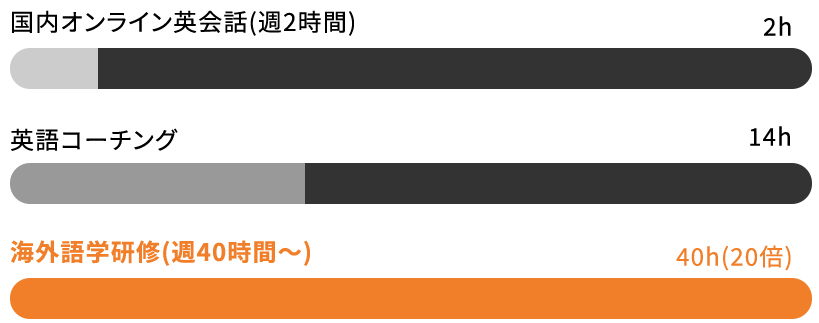 国内での学習(週2時間程度)と、海外での強制的な英語環境(週40時間以上)では、密度の差は歴然です。