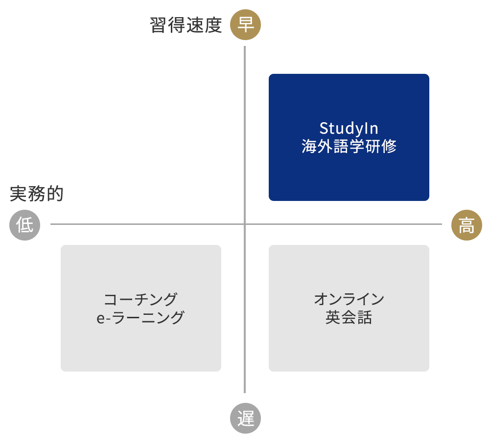 一方、海外語学研修は24時間その言語に囲まれる環境により、習熟スピードを最大化できます。同時に、実践経験できるため、両方を高いレベルで達成できる唯一の方法と言えます。
