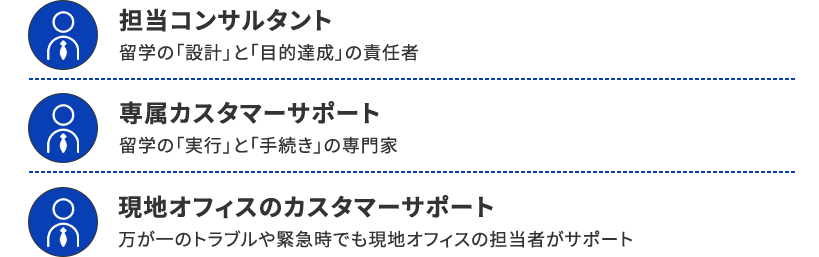 留学手続き・ビザ・航空券手配まで手数料0円で代行。計3名の専属チームが組織的にサポートします。